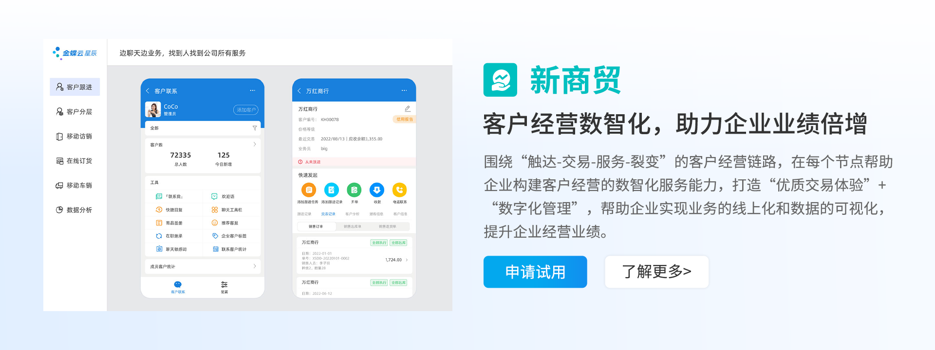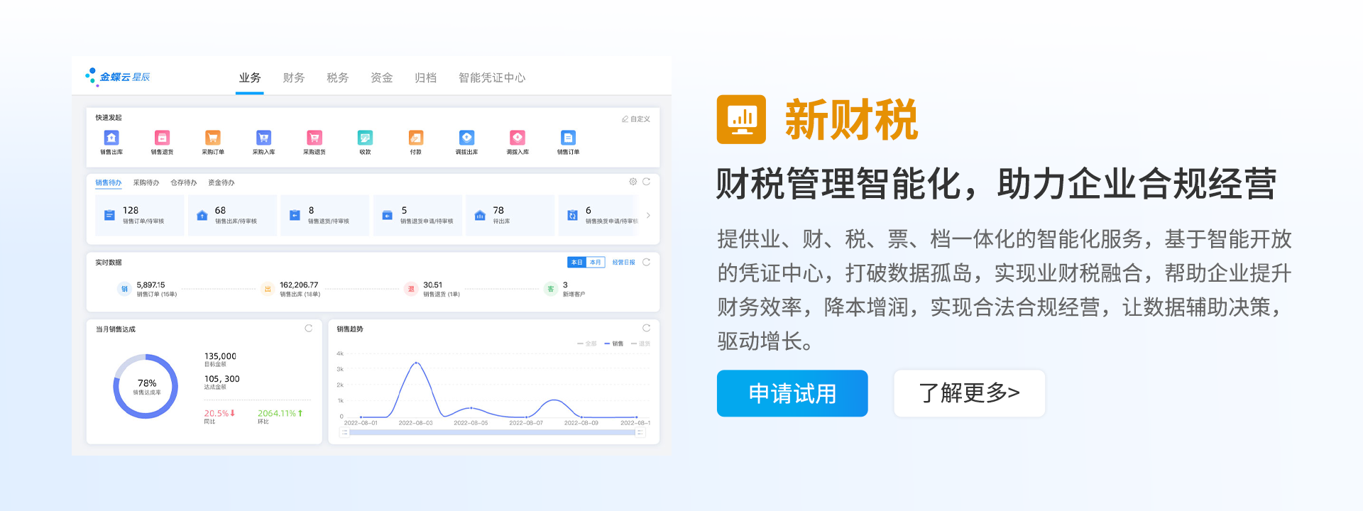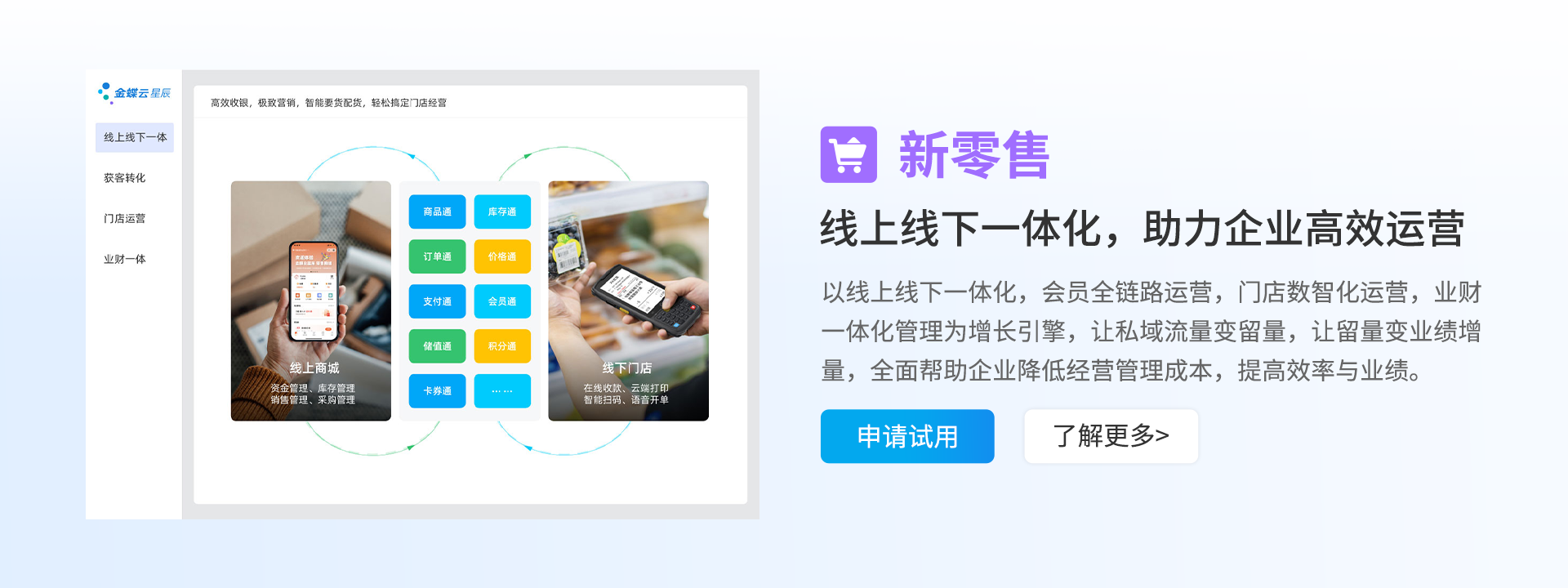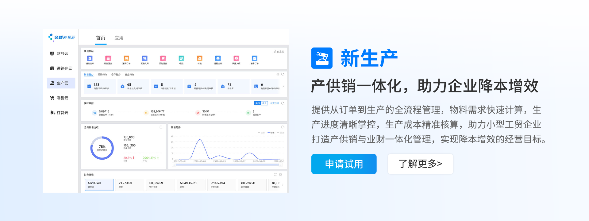 金蝶云星辰,金蝶旗下小微企业SaaS管理云,基于金蝶云·苍穹云原生PaaS平台构建,聚焦“重新定义业财税一体化”,为企业提供财务云、税务云、进销存云、生产云、零售云、电商云、订货云等SaaS服务,支撑企业拓客开源、智能管理、实时决策,助力企业实现经营+管理一体化。